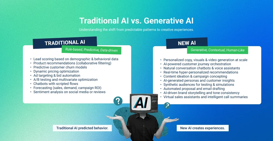 But it also pays to know that not all AI works the same way. In marketing, there are two types of AI to understand: Traditional AI and Generative AI. One predicts behavior. The other creates experiences.